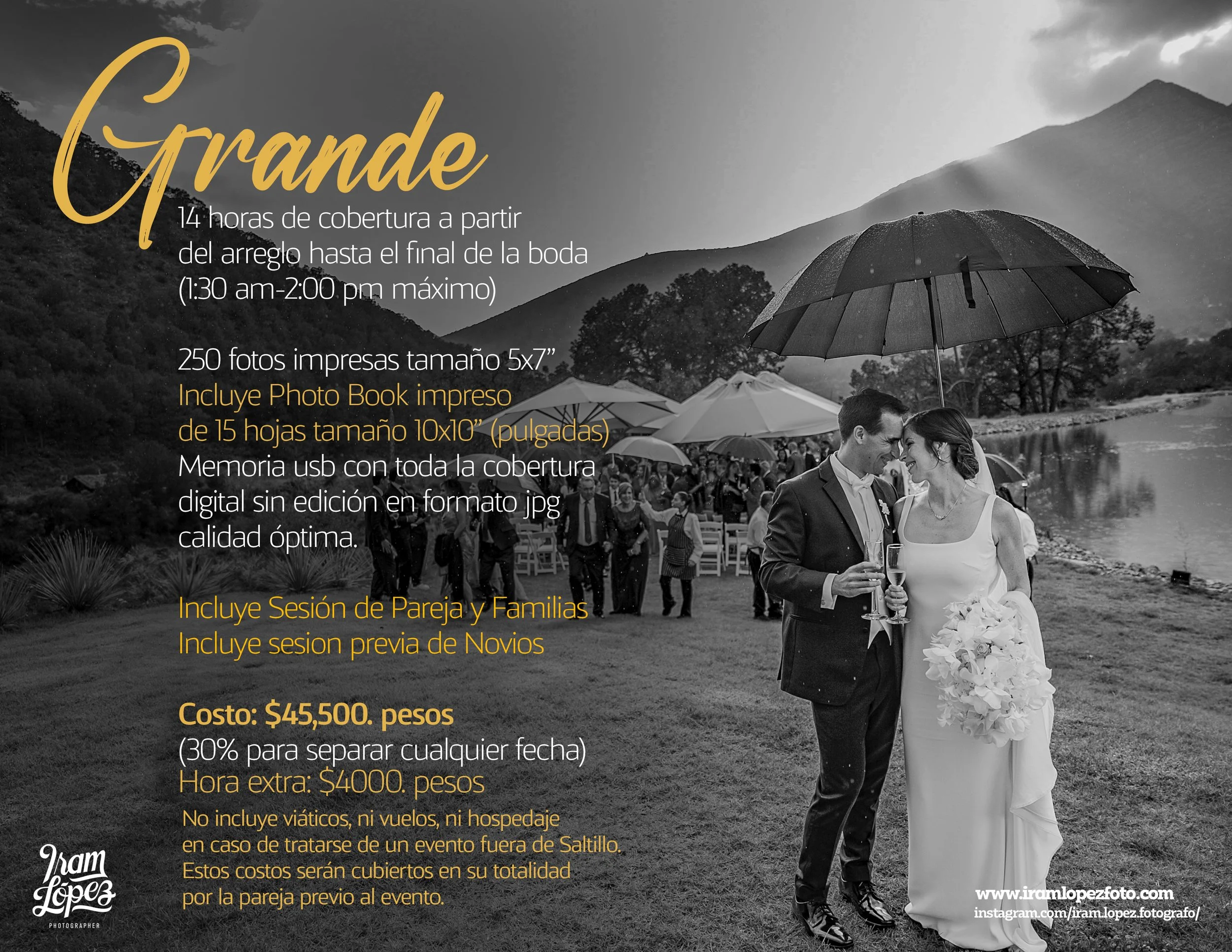 Paquete recomendado para cumplir con todas las expectativas de tu día especial, máximo 12 horas de cobertura, incluyendo sesión de pareja y familias, ceremonia religiosa y recepción. Civil incluido el mismo día, si ocurre antes se cotiza por separado. Con este paquete podemos cubrir perfectamente una boda local (en Saltillo) completa.